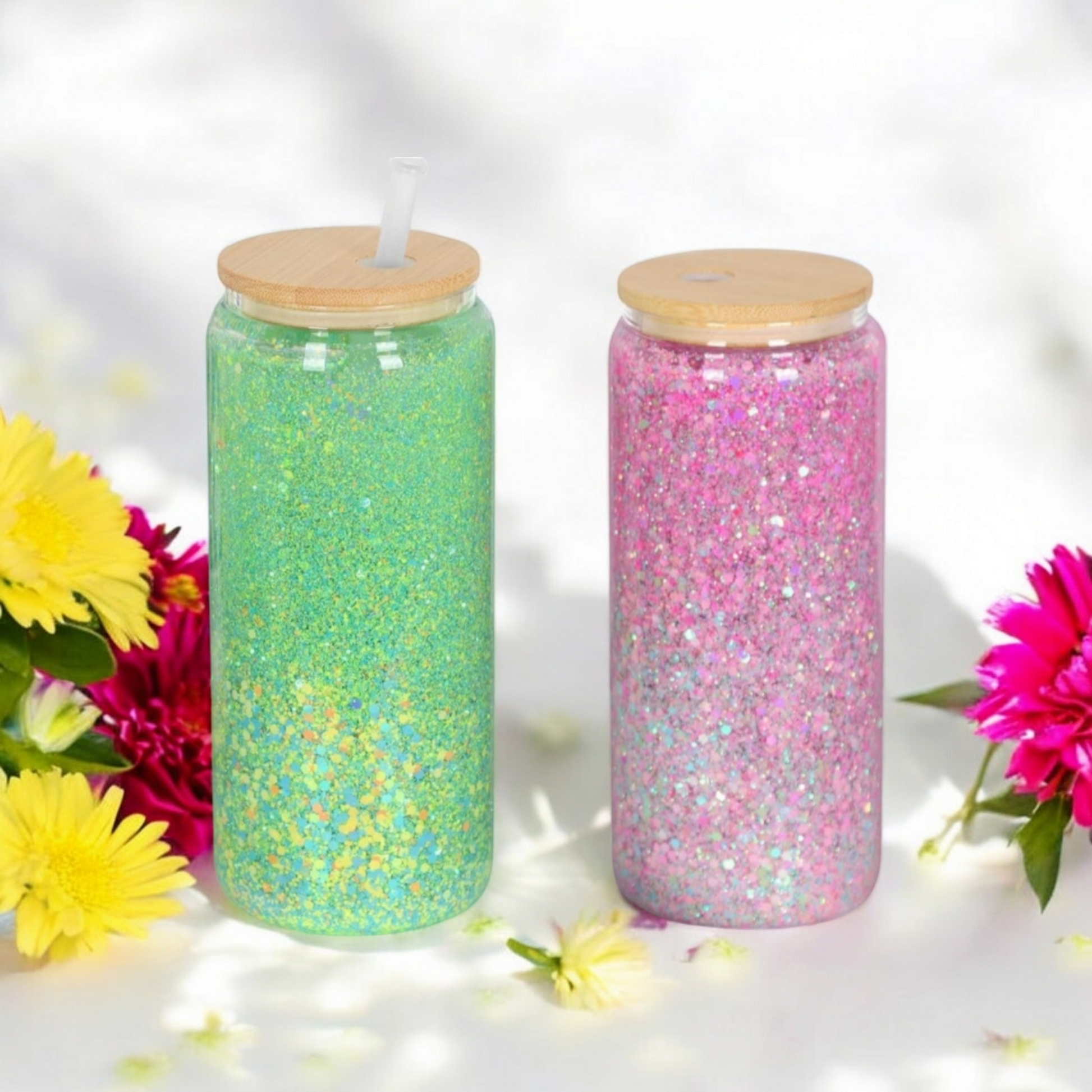 Customize your very own 20 oz glitter snow globe cup. This is a double-wall glass cup with a bamboo lid and plastic straw.