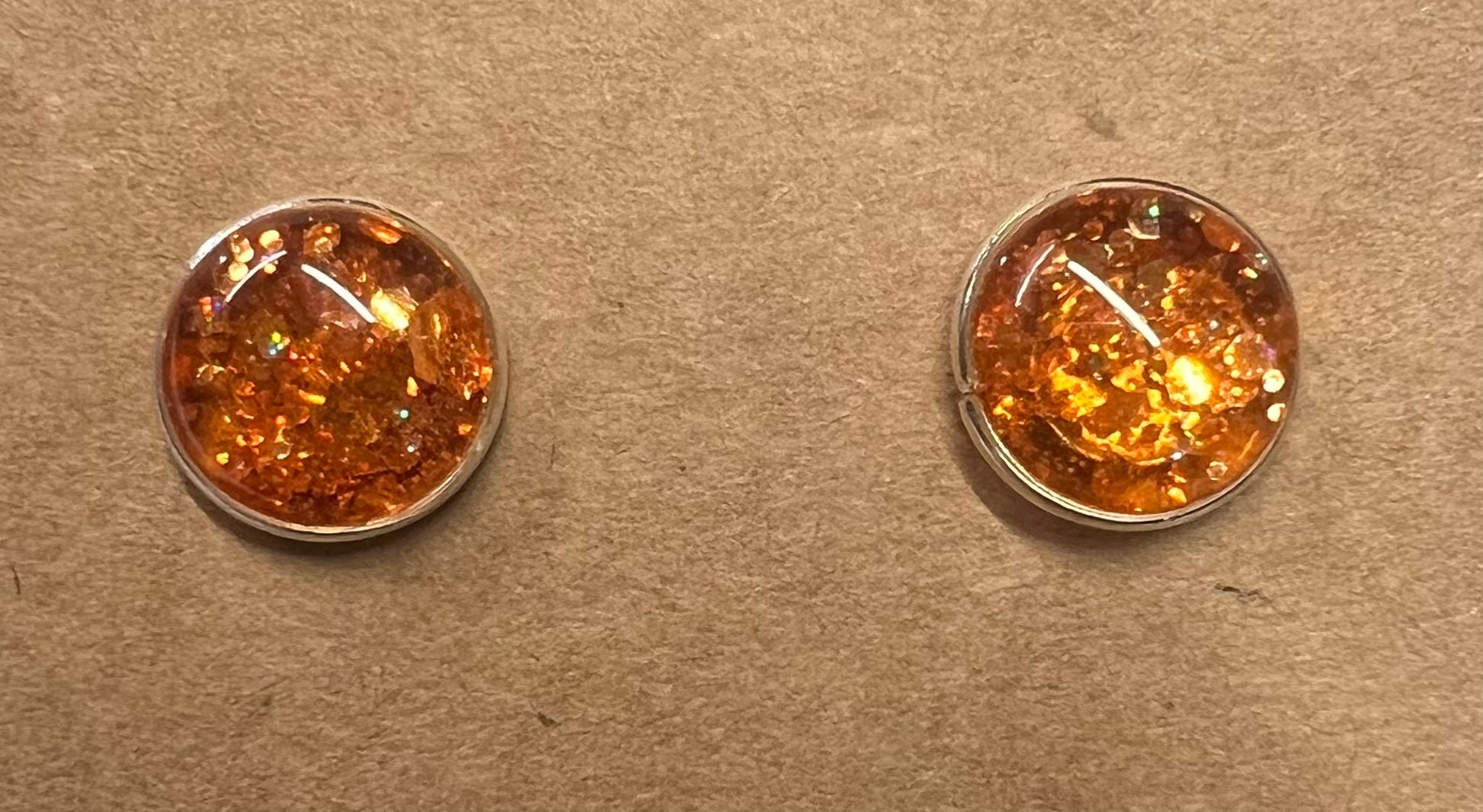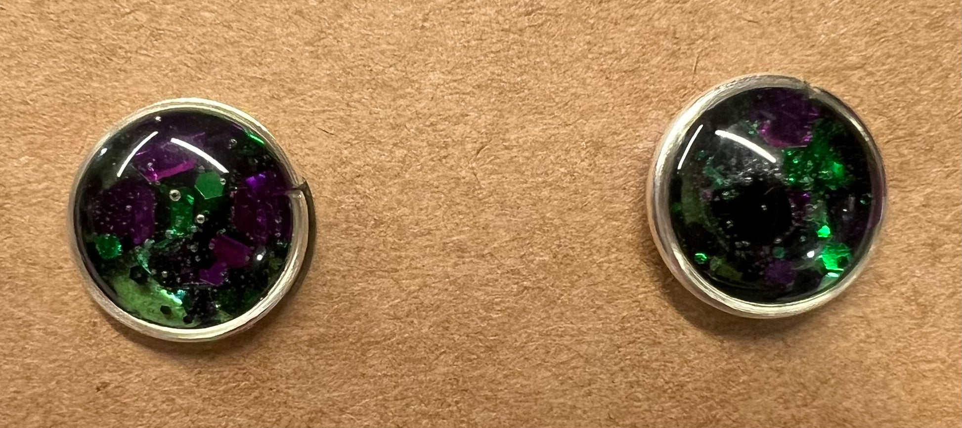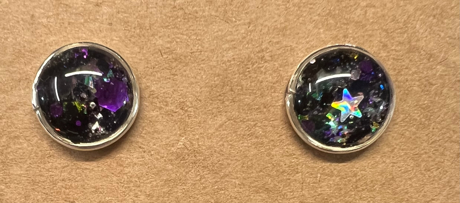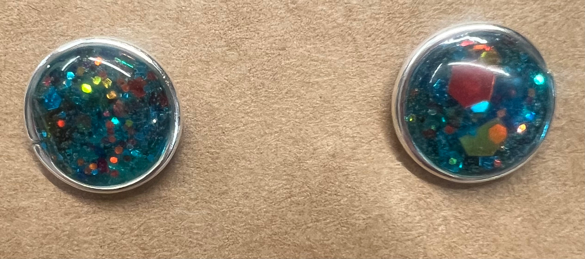 These handmade stud earrings feature carefully crafted designs using UV resin combined with glitter, crushed glass, and other unique elements. Each pair is mounted on either gold-plated or sterling silver findings, ensuring both durability and skin-friendly wear. Perfect for adding a subtle touch of sparkle and artistry to your everyday look, these earrings offer a blend of craftsmanship and quality materials.
